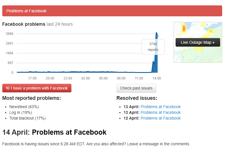 В воскресенье, 14 апреля, в по всему миру в социальной сети Facebook произошел глобальный сбой. Об этом сообщает портал Downdetector, отслеживающий работу популярных интернет-ресурсов.