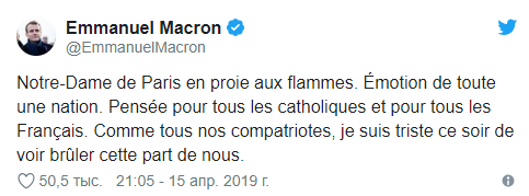 21:30 На место прибыл Эммануэль Макрон. Перед этим он написал в Twitter: "Собор Парижской Богоматери в огне. Как все наши соотечественники, я испытываю чувство большой грусти, когда вижу, как эта часть нас горит".