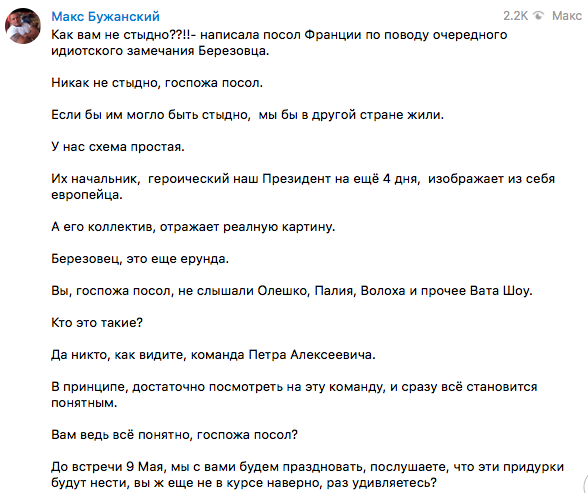 "Как вам не стыдно??!! – написала посол Франции по поводу очередного идиотского замечания Березовца.
