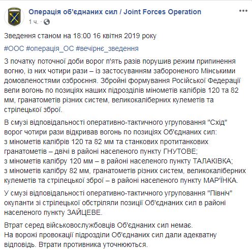 Во вторник, 16 апреля, противник пять раз нарушили "режим тишины" в районе проведения операции Объединенных сил на Донбассе. В том числе четыре раза с применением запрещенного минскими договоренностями вооружения, передает пресс-центр штаба ООС на странице в Facebook.