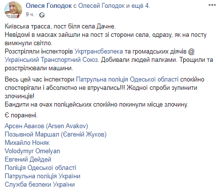 "Неизвестные в масках зашли на пост со стороны села. Расстреляли инспекторов и общественных деятелей "Украинский Транспортный Союз". Добивали людей палками. Крушили и расстреливали машины. Все это время инспекторы патрульной полиции Одесской области спокойно наблюдали и совершенно не вмешивались. Бандиты на глазах полицейских спокойно покинули место преступления", – сообщила Голодок.