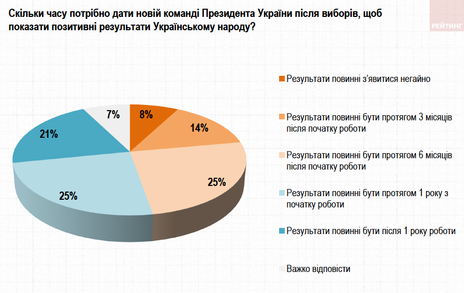 Половина опрошенных считают, что новой команде президента Украины нужно дать не меньше года, чтобы показать положительные результаты работы.Четверть хотят, чтобы достижения появились уже через полгода. Еще 14% - через квартал, 8% ждут немедленных изменений.