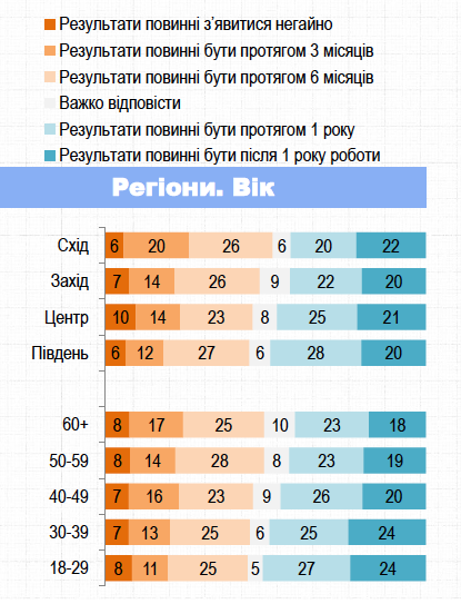Среди тех, кто готов ждать изменений год и дольше, больше жителей юга и центра Украины, а также молодых избирателей.