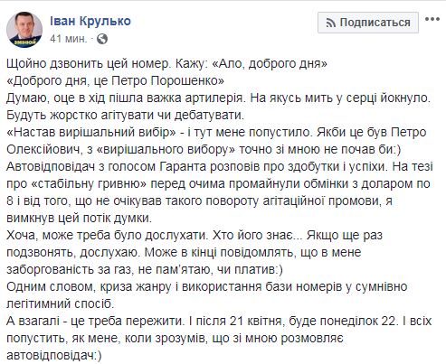 "Автоответчик с голосом Гаранта рассказал о достижениях и успехах. На тезисе о "стабильную гривну" перед глазами промелькнули обменки с долларом по 8 и от того, что не ожидал такого поворота агитационной речи, я выключил этот поток мысли. Хотя, может надо было дослушать. Кто его знает... Если еще раз позвонят, дослушаю. Может в конце сообщат, что у меня задолженность за газ, не помню, платил:) Одним словом, кризис жанра и использование базы номеров сомнительно легитимный способ. А вообще - это надо пережить. И после 21 апреля будет понедельник, 22-е. И всех попустит, как меня, когда понял, что со мной разговаривает автоответчик:)", - сообщил Крулько.