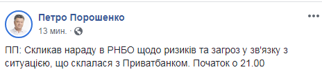 "Созвал совещание в СНБО относительно рисков и угроз в связи с ситуацией, которая сложилась с ПриватБанком. Начало в 21.00", - сообщается в аккаунтах Порошенко в Facebook и Twitter.