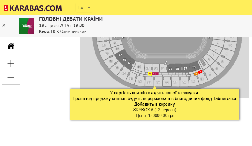 При нажатии кнопки "Купить" открывается информация, что за 120 тысяч гривен и за 140 тысяч гривен можно разместиться в вип-секторе компанией из 12 человек. В стоимость входят напитки и закуски.