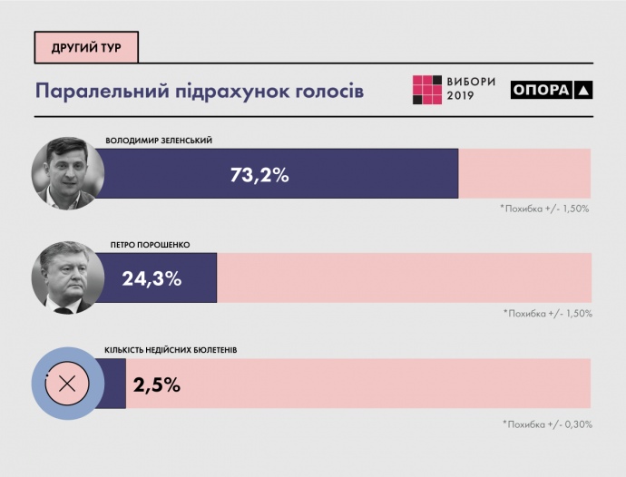 "С 99% уверенностью гражданская сеть Опора может заявить о таких результатах второго тура выборов: Владимир Зеленский получил 73,2% голосов избирателей, а Петр Порошенко - 24,3%. Еще 2,5% бюллетеней - недействительны", - говорится в сообщении.
