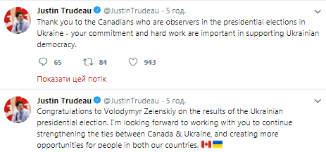 "Поздравляю Владимира Зеленского с результатами президентских выборов в Украине. Я с нетерпением ожидаю совместной работы с вами для дальнейшего укрепления связей между Канадой и Украиной и создания новых возможностей для людей в обеих наших странах", - написал Трюдо.