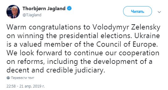 "Теплые поздравления Владимиру Зеленскому с победой на президентских выборах. Украина является важным членом Совета Европы. Мы надеемся на продолжение сотрудничества в сфере реформ, включая развитие достойной и надежной судебной системы", - отметил Ягланд.