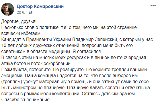 "Кандидат в Президенты Украины Владимир Зеленский, с которым у нас 10 лет добрых дружеских отношений, попросил меня быть его советником в области медицины. Я согласился.
