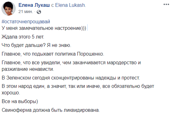 Все на выборы. Свиноферма должна быть ликвидирована", пишет в Facebook адвокат Елена Лукаш.