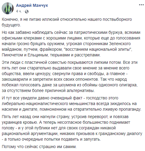 12.04 Мы сделали очень любопытный обзор соцсетей, из которого наглядно видно, как вчерашние яростные сторонники Порошенко и критики Зеленского спешно меняют риторику, и, как выразились, некоторые пользователи уже "переобуваются в воздухе". Посмотреть наш обзор соцсетей можно здесь.
