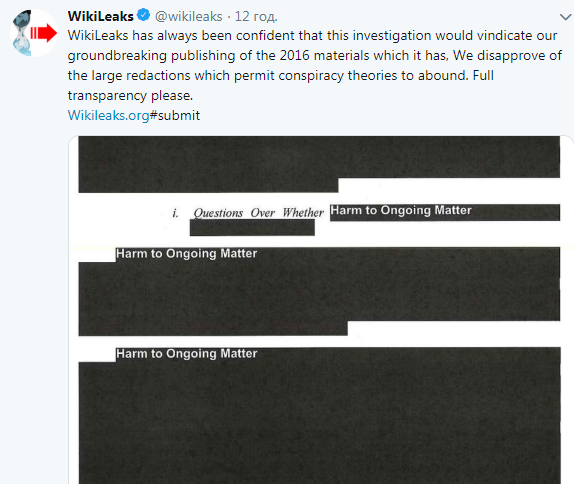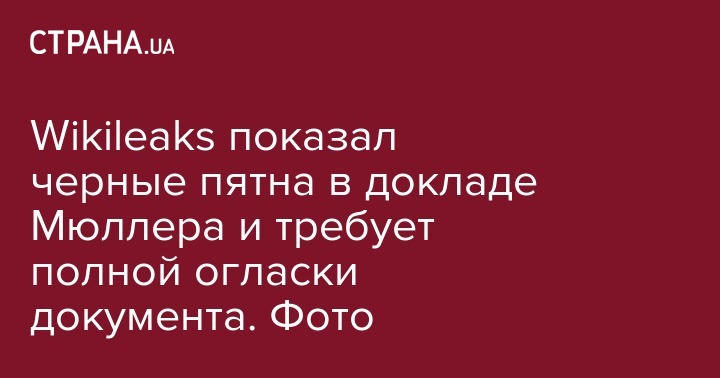 После того, как Минюст США 18 апреля опубликовал доклад спецпрокурора Мюллера о вмешательстве России в выборы 2016 года, портал Wikileaks заявил, что документ содержит значительные купюры и призвал власти обнародовать полную версию отчета спецпрокурора.