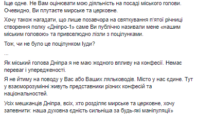 Только позавчера лез ко мне целоваться и называл "нашим мэром" в присутствии сотни людей, а уже сегодня выполз на пресс-конференцию. Мерзко", написал мэр Днепра на своей стрнице в соцсети и опубликовал открытое обращение к священнослужителю.