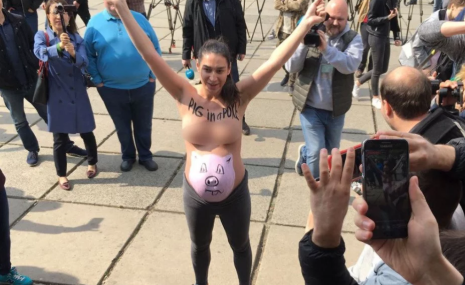 На участке Зеленского произошел небольшой инцидент. Туда пришла активистка Femen. Беременная женщина выкрикивала слоган: "Хватит насиловать страну!". Когда Зеленский зашел на участок, она сняла одежду и осталась в одних брюках. На животе у нее была нарисована морда кота, что отсылает к спичу Петра Порошенко на дебатах. который назвал Зеленского котом в мешке. Активистка отметила, что выступает против обоих кандидатов в президенты Украины. По предварительным данным, полиция не задержала представительницу Femen.