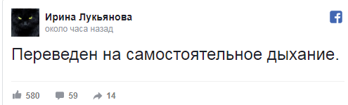 "Переведен на самостоятельное дыхание", - говорится на странице Ирины Лукьяновой.