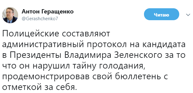 Сегодня, 21 апреля, народный депутат Антон Геращенко допустил опечатку в своем микроблоге в Twitter, когда комментировал составление полицейскими протокола на кандидата в депутаты Владимира Зеленского за то, что тот показал журналистам заполненный бюллетень на камеру.