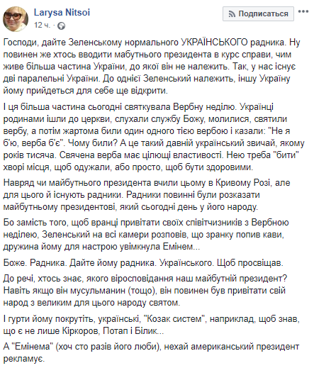 Известная своими скандальными заявлениями украинская писательница Лариса Ницой высказала негодование, что Владимир Зеленский в день второго тура президентских выборов, совпавшим с Вербным воскресеньем, не поздравил украинцев с этим днем, знаменующим начало Страстной недели.