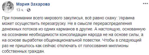 "При понимании всего мирового закулисья, всё равно скажу: Украина может осуществить перезагрузку. Не в смысле перераспределения денежных потоков из одних карманов в другие. А настоящую, основанную на осознании необходимости консолидации народа не на основе силы, а на основе выработки общенациональной повестки. Чтобы в следующий раз не пришлось как сейчас отключать от голосования миллионы собственных граждан", - написала она в Facebook.