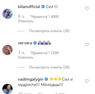 Его поздравили комик Михаил Галустян, телеведущая Ксения Собчак. "Сил!" - написал певец Дима Билан. "Сил и мудрости. Молодцы" - пожелал юморист Вадим Галыгин. В комментариях отметилась и певица Вера Брежнева, которая снималась вместе с Владимиром Зеленским в фильмах. Поздравила с победой и певица Наташа Королева.