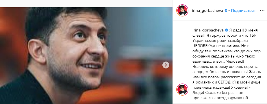 Российская актриса театра и кино Ирина Горбачева также посвятила победе Владимира Зеленского отдельный пост.