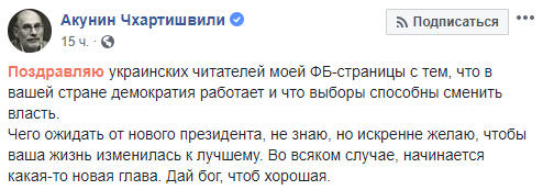 "Поздравляю украинских читателей моей ФБ-страницы с тем, что в вашей стране демократия работает и что выборы способны сменить власть. Чего ожидать от нового президента, не знаю, но искренне желаю, чтобы ваша жизнь изменилась к лучшему. Во всяком случае, начинается какая-то новая глава. Дай бог, чтоб хорошая", - написал он в Facebook.