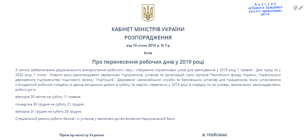 Нормативный акт не относится к органам Пенсионного фонда, "Укрпочты", Государственного казначейства и банковских учреждений. Следовательно, руководители и владельцы небюджетных предприятий имеют право самостоятельно установить рабочие дни в 2019 году, не ссылаясь на рекомендации КМУ.