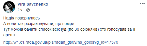 Фото нардепа обнародовала и ее сестра Вера. "Надежда вернулась. А они так рассчитывали. что она умрет", - написала она и добавила снимок перед Верховной Радой и список депутатов, проголосовавших за арест ее сестры.