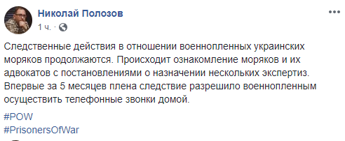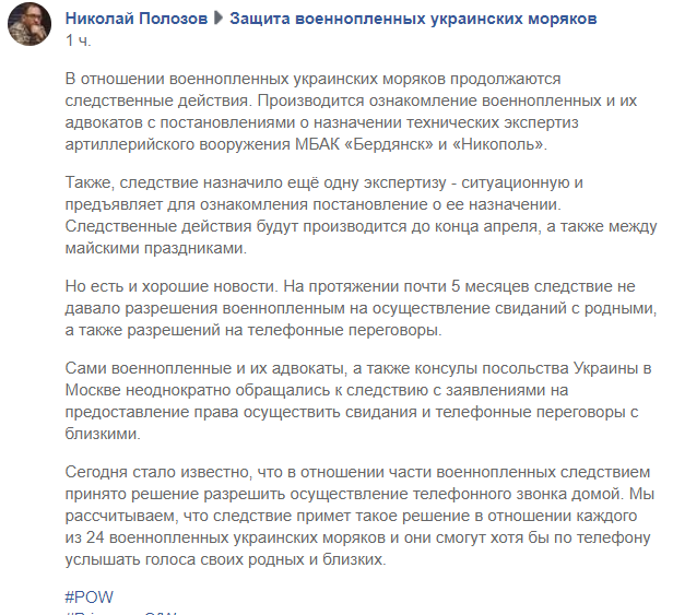 Защитник отметил, что ранее следствие не давало разрешения военнопленным на осуществление свиданий с родными, а также на телефонные переговоры. По словам Полозова, военнопленные, адвокаты, а также консулы посольства Украины в Москве неоднократно обращались с заявлениями о праве на свидание и телефонные разговоры с близкими. "Сегодня стало известно, что в отношении некоторых военнопленных следствие приняло решение разрешить осуществление телефонного звонка домой", - написал Полозов.