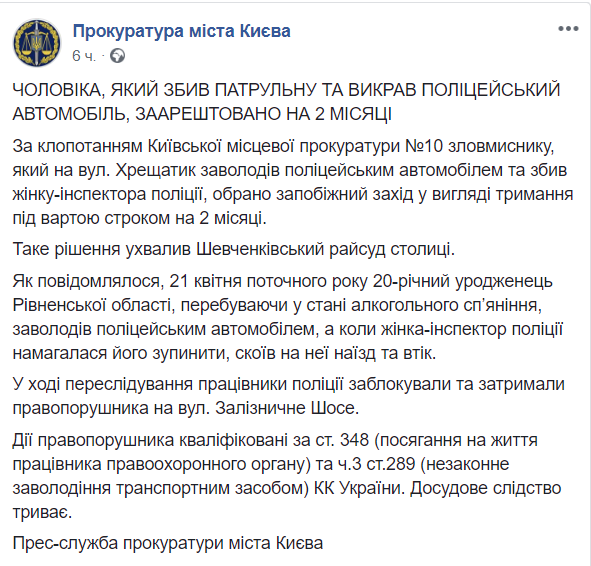 Шевченковский райсуд Киева избрал меру пресечения в виде содержания под стражей сроком на 2 месяца по ходатайству Киевской местной прокуратуры №10 для злоумышленника, который на Крещатике угнал полицейскую машину и сбил патрульную. Об этом сообщает столичная прокуратура в соцсети Facebook.