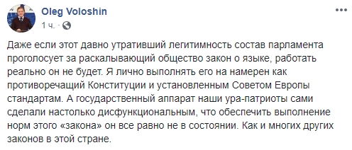 Политический эксперт Олег Волошин считает, что закон нефункционален: "Даже если этот давно утративший легитимность состав парламента проголосует за раскалывающий общество закон о языке, работать реально он не будет. Я лично выполнять его на намерен как противоречащий Конституции и установленным Советом Европы стандартам. А государственный аппарат наши ура-патриоты сами сделали настолько дисфункциональным, что обеспечить выполнение норм этого "закона" он все равно не в состоянии. Как и многих других законов в этой стране".