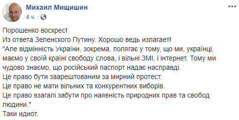 "Глупость, к сожалению, станет государственной политикой. В ответ на намерение Путина выдавать российские паспорта украинцам в Украине, Зеленский намерен выдавать украинские паспорта россиянам ... тоже в Украине. Эй, новоизбранные, вы там Путину "ответку" или подарки готовите? Представляете себе количество российских "диссидентов" в звании от прапорщика до полковника ФСБ, ГРУ и других полезных аббревиатур станут в очередь за украинским паспортом? Не представляете? Я так и думал. После этого заявления в Кремле под хохот шампанское открывали, а не заседание Совета Безопасности. Готов он к переговорам,
