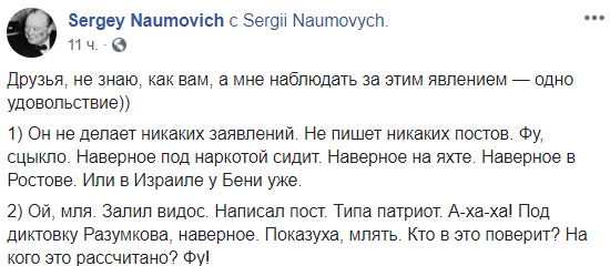2) Ой, мля. Залил видос. Написал пост. Типа патриот. А-ха-ха! Под диктовку Разумкова, наверное. Показуха, млять. Кто в это поверит? На кого это рассчитано? Фу!"