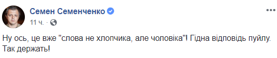 "Ну вот, это уже "слова не мальчика, но мужа!" Достойный ответ пуйлу. Так держать!", - написал нардеп Семен Семенченко.