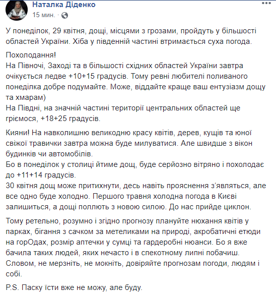 Словом, не мерзните, ​​не мокните, доверяйте прогнозам погоды, людям и себе. P.S. Пасху есть не могу, но буду", - добавила Наталья Диденко.