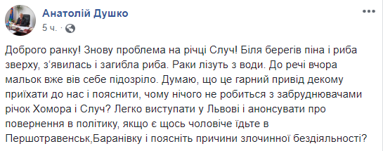 "Опять проблема на реке Случ! У берегов пена и рыба сверху, появилась и погибшая рыба. Раки лезут из воды. Кстати, вчера малек уже вел себя подозрительно. Думаю, что это хороший повод некоторым приехать к нам и объяснить, почему ничего не делается с загрязнителями рек Хомора и Случ?", - написал Душко. Мэр также опубликовал фото погибшей рыбы.
