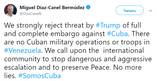 Дональд Трамп обвинил Кубу в отправке войск в Венесуэлу - и пригрозил острову полным эмбарго. "Если кубинские войска и ополчение немедленно не прекратят военные и другие операции с целью вызвать смерти и уничтожение конституции Венесуэлы, на острове будет введено полное эмбарго и санкции высшего уровня", - написал президент США в Twitter. Кубинский лидер Мигель Диас-Канель осудил угрозы Трампа и заявил, что кубинских военных в Венесуэле нет.