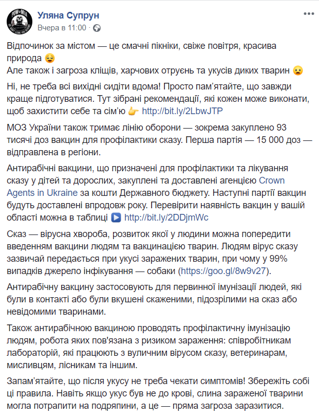 По словам Супрун, вакцинация применяется и в профилактических целях, и после укуса.