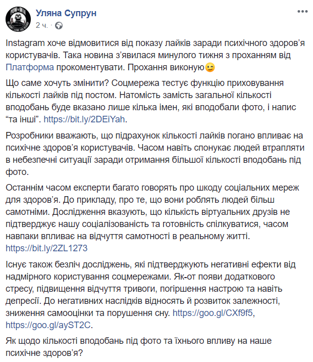 Итак, относительно количества лайков под фото и их влияния на наше психическое здоровье, Супрун делится такими соображениями:
