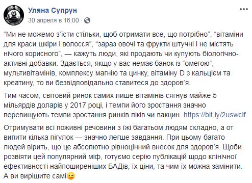 Результат от применения витаминных и биологически-активных добавок может быть не таким, как обещают производители, также могут быть побочные эффекты. Об этом в Facebook сообщила и.о. министра здравоохранения Ульяна Супрун.
