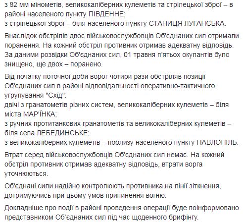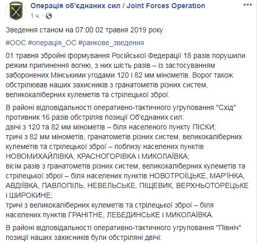 "1 мая вооруженные формирования РФ 18 раз нарушили режим прекращения огня, из них шесть раз - с применением запрещенных Минскими соглашениями 120 и 82 мм минометов. Враг также обстреливал наших защитников из гранатометов различных систем, крупнокалиберных пулеметов и стрелкового оружия….Вследствие обстрелов двое военнослужащих Объединенных сил получили ранения" - говорится в утренней сводке.