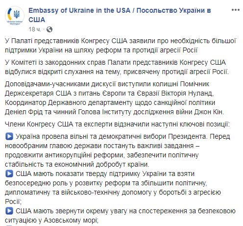 Согласно сообщению украинского посольства, члены конгресса США и эксперты отметили ключевые позиции: