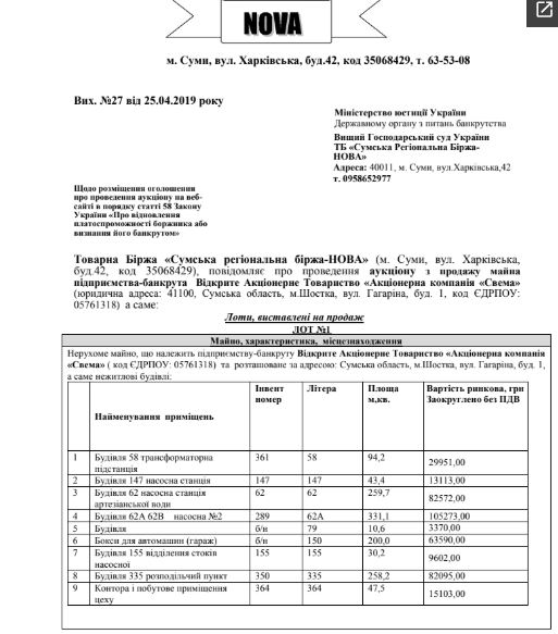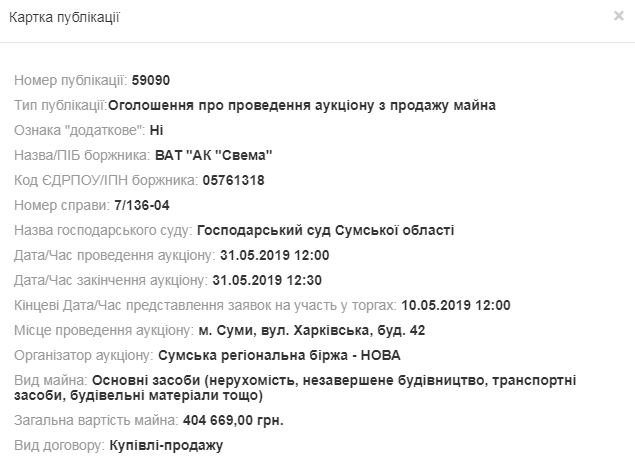 Известный советский и украинский завод видео- и фотопленок "Свема" (Шостка, Сумская область), имевший в СССР стратегическое значение, выставлен на продажу по остаточной цене в 404 669,00 грн. (чуть более $15 тыс.) Объявление о проведении аукциона по продаже имущества ОАО "АК "Свема", назначенного на 31.05.2019 года, размещено на сайте Минюста.
