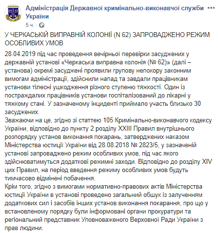 После бунта заключенных, который случился 28 апреляв Черкасской исправительной колонии №62, в учреждении введен режим особых условий. Об этом сообщает пресс-служба Государственной уголовно-исправительной службы на странице в Facebook.