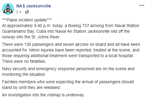 В США авиалайнер Boeing 737 со 136 пассажирами на борту съехал со взлетно-посадочной полосы и рухнул в реку Сент-Джонс возле Джексонвилла, штат Флорида. Об этом в Twitter сообщил офис шерифа города.