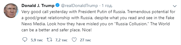 "Вчера был очень хороший телефонный разговор с президентом России Путиным. Есть потрясающий потенциал для хороших или даже – отличных отношений с Россией, несмотря на все то, что вы читаете и видите в новостях от фейковых СМИ", - написал он.