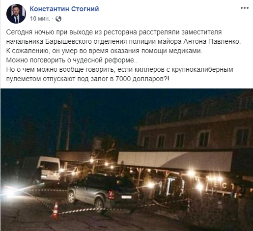 Журналист Константин Стогний отметил, что погибшего начальника Барышевского отделения полиции, звали Антон Павленко. Он был в чине майора и умер во время оказания помощи медиками.