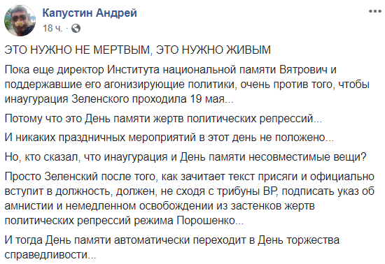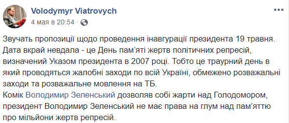 "Пока еще директор Института национальной памяти Вятрович и поддержавшие его агонизирующие политики, очень против того, чтобы инаугурация Зеленского проходила 19 мая...