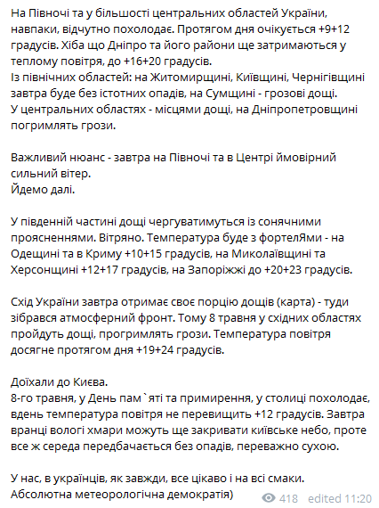 "На севере и в большинстве центральных областей Украины, наоборот, ощутимо похолодает. В течение дня ожидается +9...+12 градусов. Разве что Днепр и его районы еще останутся в тепле, до +16...+20 градусов. В северных областях: Житомирской, Киевской, Черниговской - завтра будет без осадков, в Сумской - грозовые дожди. В центральных областях - местами дожди, в Днепропетровской погремят грозы", - написала Диденко.