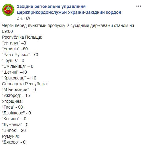 "Очереди перед пунктами пропуска с соседними государствами по состоянию на 09:00. Республика Польша: "Устилуг" - 0, "Угринов" - 50, "Рава-Русская" - 70, "Грушев"- 0, "Смильница" – 0, "Шегини" - 40, "Краковец" - 110 ", - говорится в сообщении.
